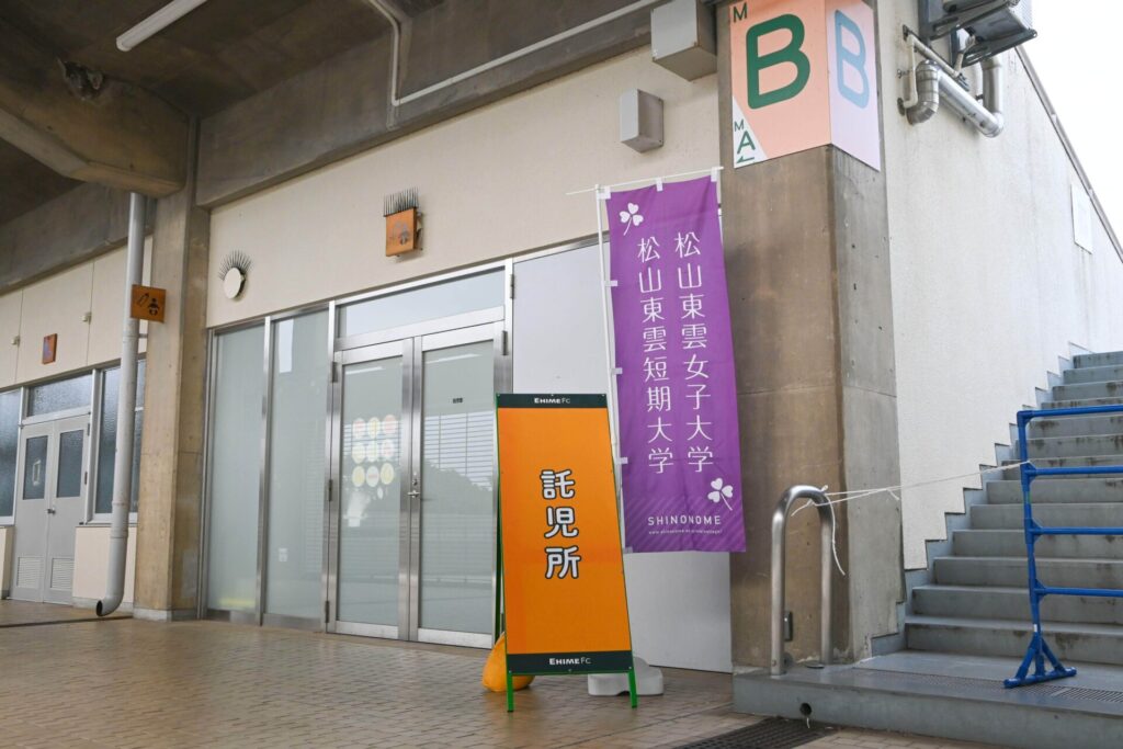 6月21日に開催された明治安田J2第20節 レノファ山口FC戦より、本学(松山東雲短期大学)保育科による託児ボランティアを実施しています。託児ボランティアは、保育科の教員(有資格者)1名と学生2名がホームゲーム開催日に担当し、ホームゲーム最終日となる11月23日(日)開催の第37節 ロアッソ熊本戦まで実施を予定しています。