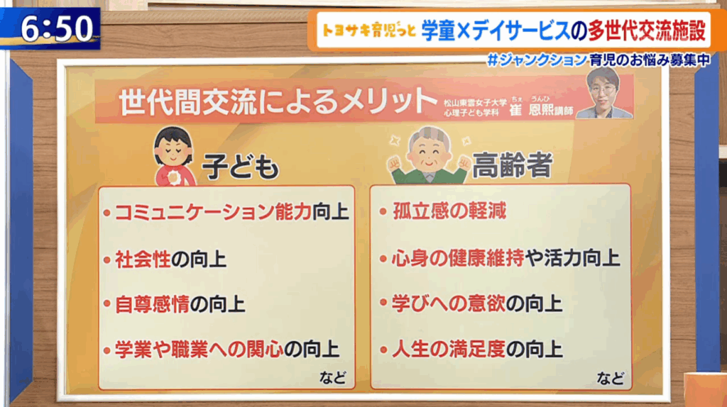 この回では、「子どもと社会のつながりを・・・見直される世代間交流」をテーマに、[高齢者デイサービス][子育てひろば][学童保育クラブ]が一体となった複合型福祉施設の事例が取り上げられました。世代間交流の専門家として、子ども側・高齢者側の双方にメリットがある点についての見解が番組内で紹介されました。