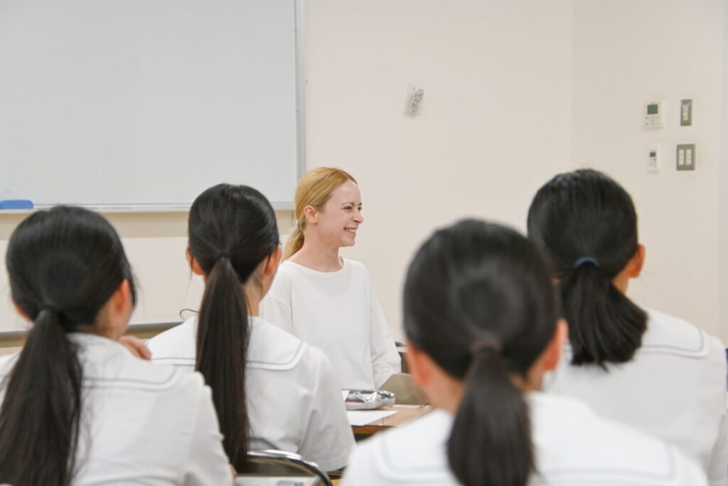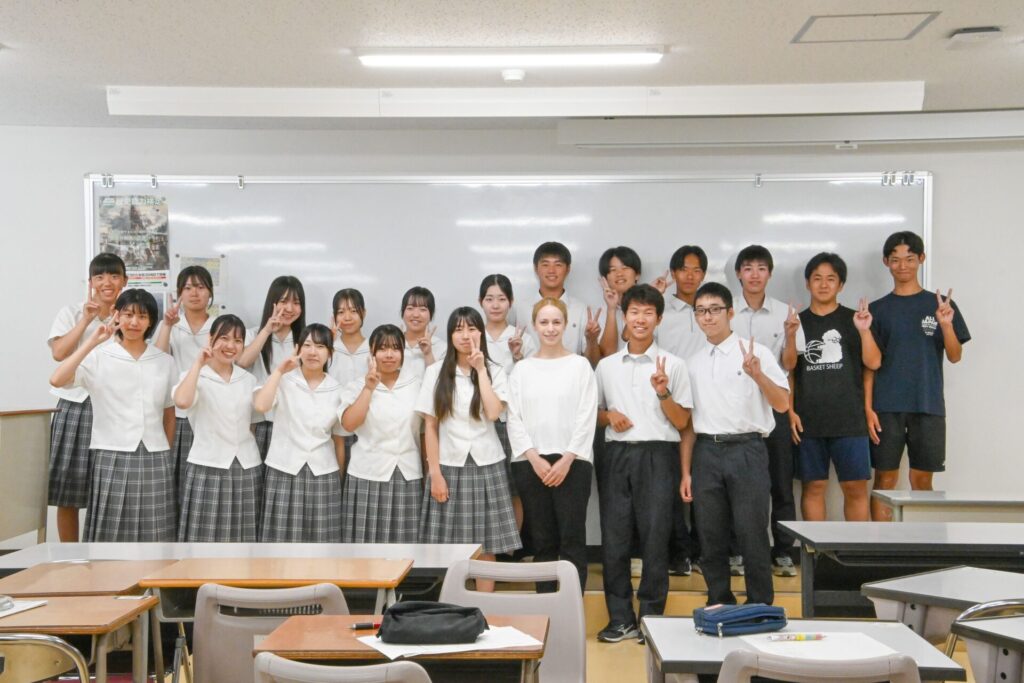 この授業では、アメリカやフィリピンなど4つの国・地域の中から生徒が関心のある一つを選び、その文化や歴史を学びます。ジョルジェッタさんは「ルーマニア」コースを選んだ約20名の生徒から事前に寄せられた観光地、防災、歴史的背景など幅広い質問に対し、自身の経験を交えながら丁寧に答え、生徒たちの理解を深めました。