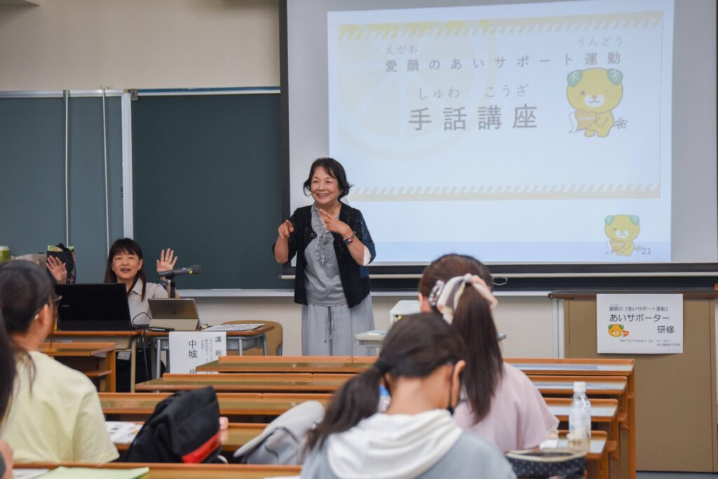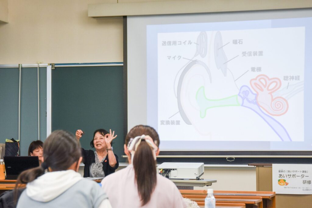 7月28日、松山東雲女子大学 社会福祉専攻の授業「障害者福祉論」において、えひめ県難聴者連合会「みみの会」および一般社団法人人工内耳友の会ACITA愛媛支部の支部長である中城 尚子 様を講師にお招きし、愛媛県が推進する「あいサポート運動」に関する研修を実施しました。本学での実施は今回が初めてです。