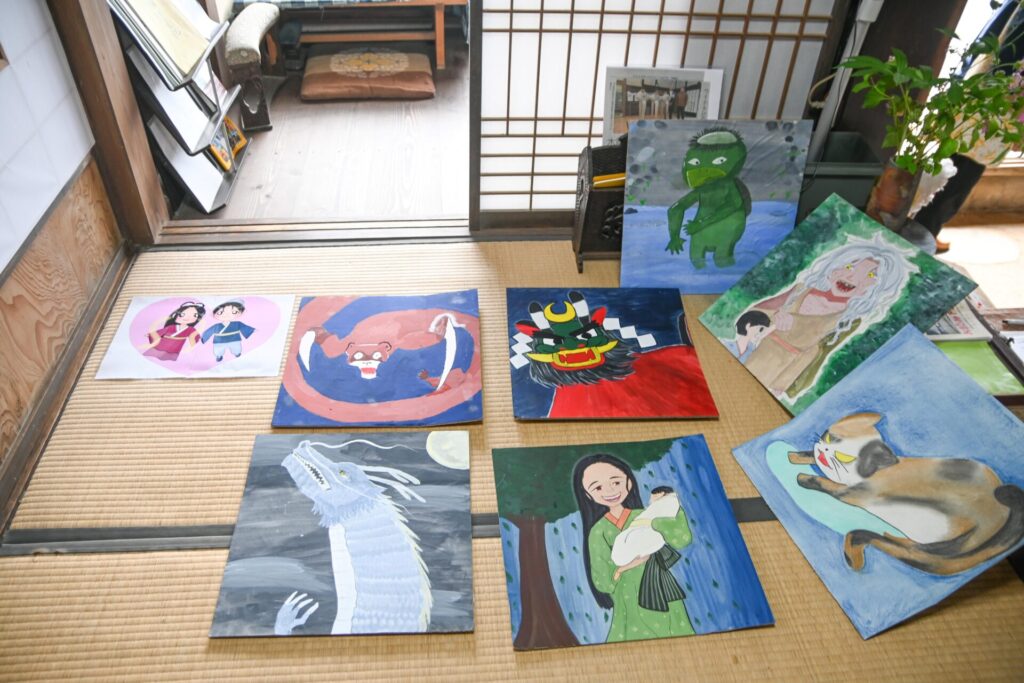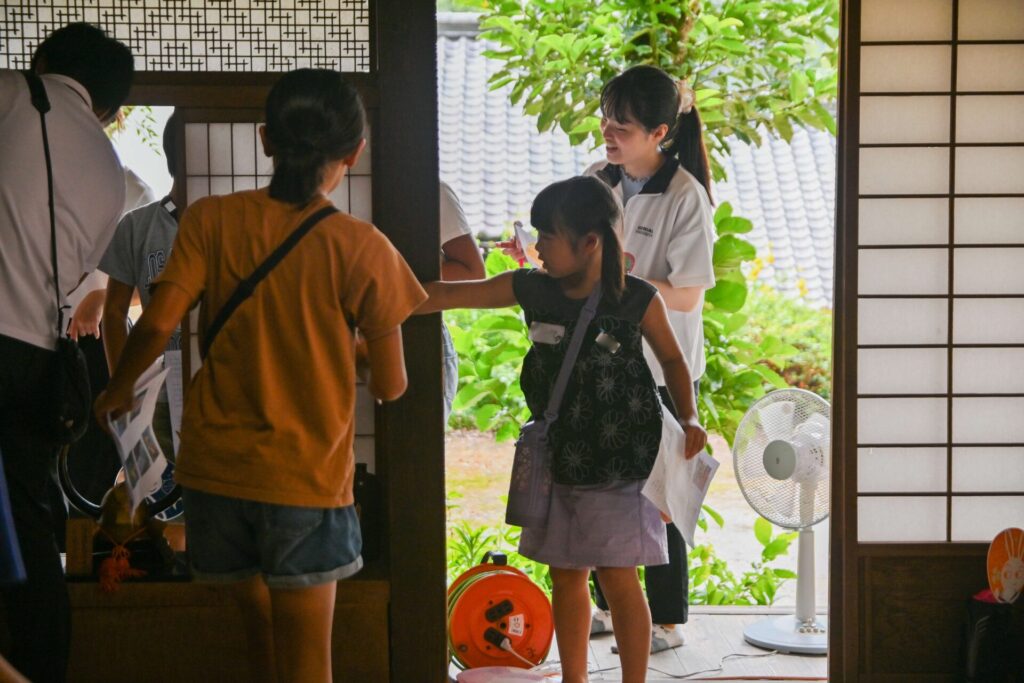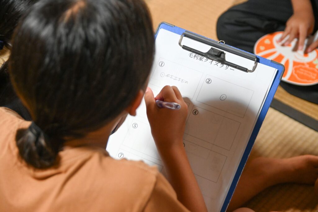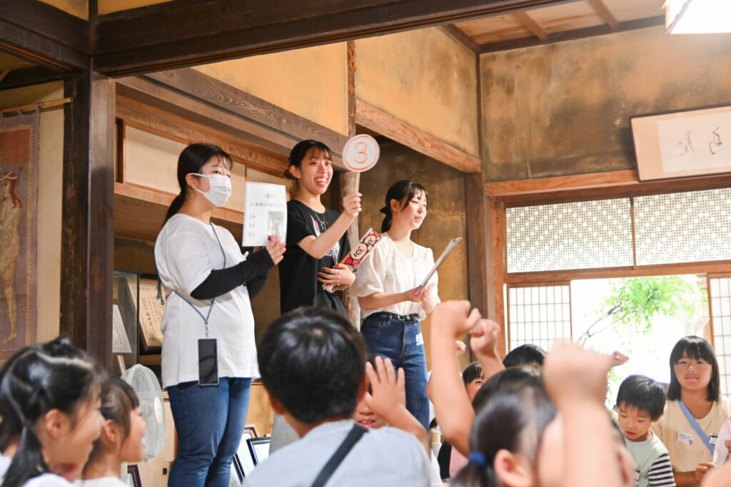 当日は学生が司会を務め、歌やクイズラリーを通じて交流を深めました。特に「毛利家の屋根は何でできているでしょうか」といった建物にまつわるクイズや、学生が手作りした三間町周辺に伝わる妖怪の絵を屋敷内で探すゲームが大いに盛り上がり、子どもたちの笑顔があふれるひとときとなりました。