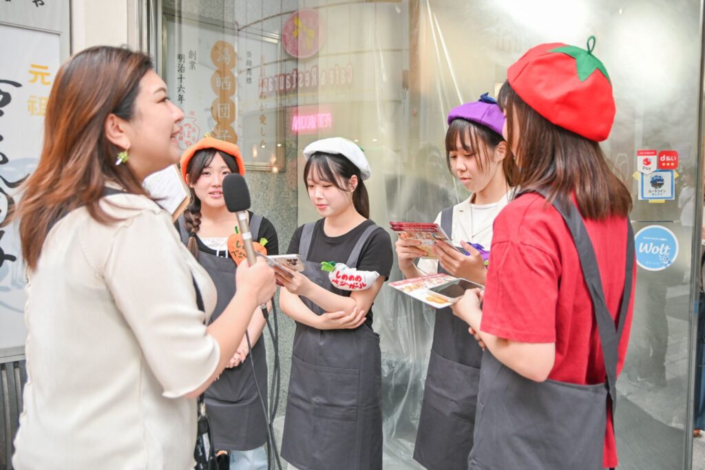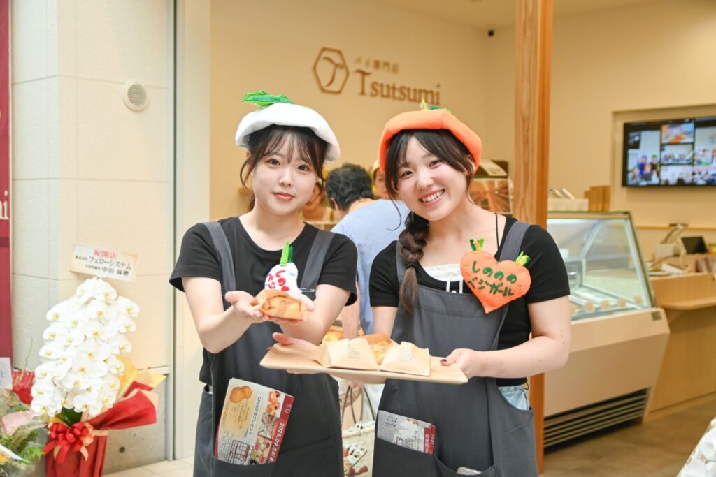 オープン初日には、10時から14時まで、しののめベジガールが店頭に立ち、来店されたお客様に直接商品の魅力を紹介しました。学生たちは観光客にチラシを配布し、道後の新たなスイーツとして商品をPR。会場には多くのお客様が訪れ、6社の報道機関による取材も受けました。さらに、オープンの様子としののめベジガールのインタビューがラジオで生中継され、それを聴いて来店された方もあり、大変な賑わいとなりました。