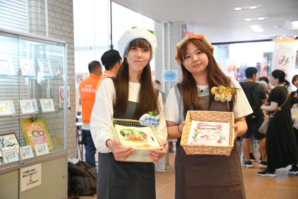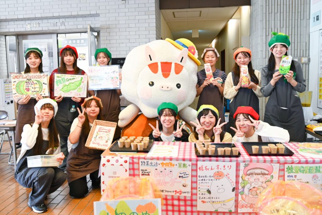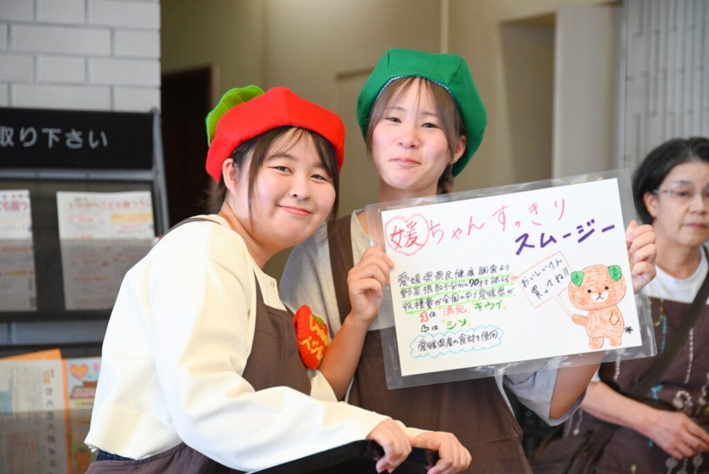 発表後は、初代しののめベジガールが考案したレシピによる野菜スムージーの試飲会も実施。「媛ちゃんすっきりスムージー」「かぼちゃdeとろとろスムージー」「枝豆Greenスムージー」の3種類を提供し、学生たちがブースで来場者に手渡しました。