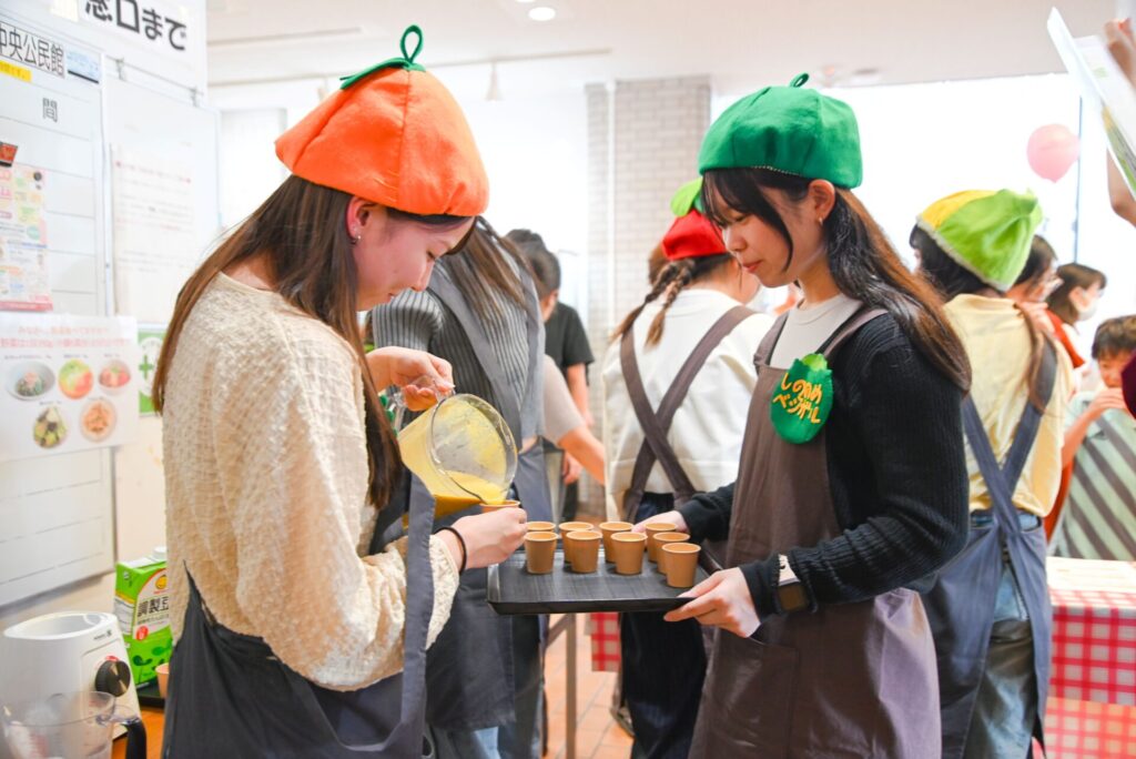 「かぼちゃdeとろとろスムージー」を飲んだ小学生からは「カボチャは好きじゃないけどおいしかった」「飲みやすかった」といった声が聞かれました。学生たちは地域の方々と交流しながら、食と健康づくりについて実践的に学ぶ機会となりました。