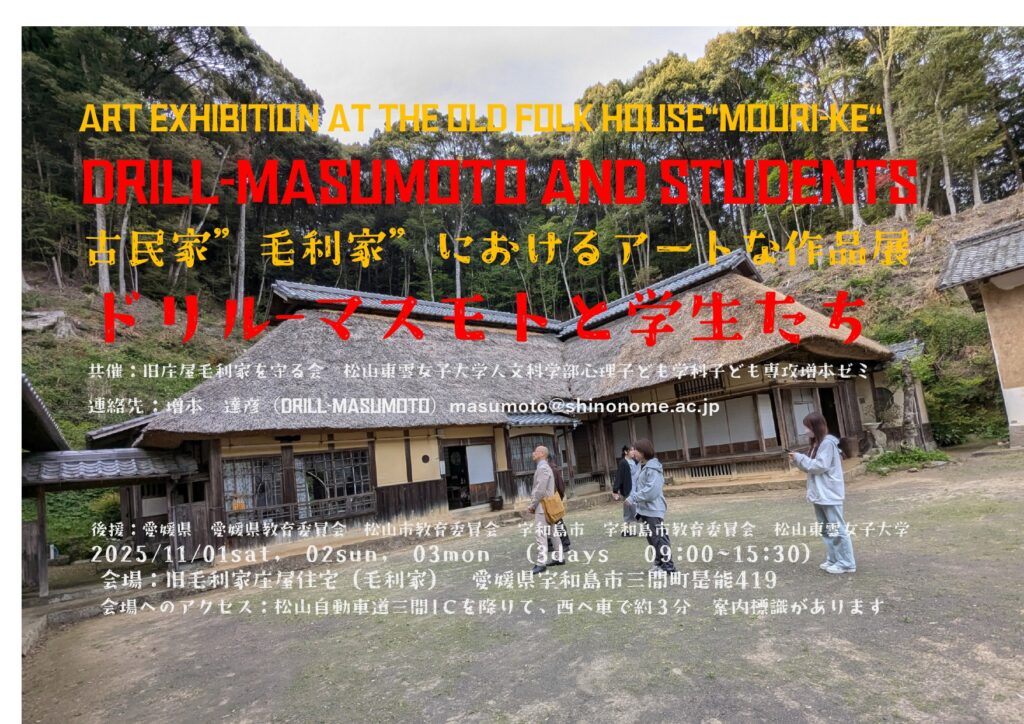 2025年11月1日(土)から3日(月)の3日間、松山東雲女子大学 子ども専攻の増本達彦教授(専門:立体造形)と学生たちによる作品展「古民家 “毛利家” におけるアートな作品展 Drill-masumoto(ドリル-マスモト)と学生たち」を開催します。会場は江戸期の庄屋建築として知られる宇和島市三間町の旧庄屋毛利家(市指定有形文化財)で、開場時間は各日9時から15時30分までです。 本展は、歴史ある古民家空間と美術作品の融合をテーマに、増本教授と学生による多彩な造形作品を展示します。