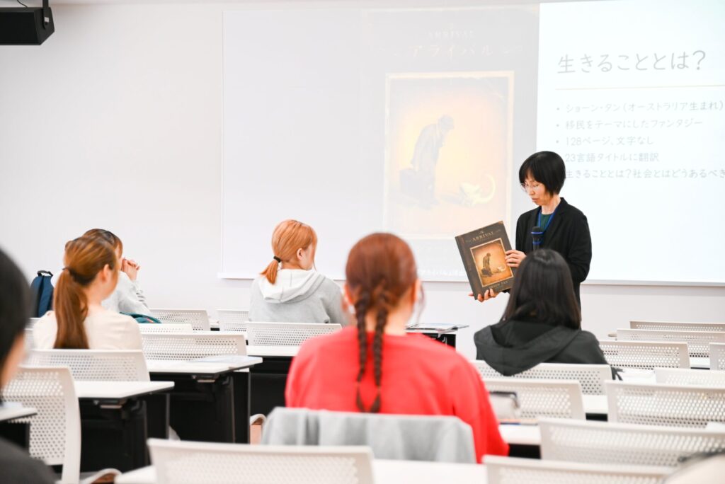 初日の3限目「絵本とはなにか」では、「こども本の森 松山」室長であり、「絵本専門士」の資格を持つ菅弥和乃先生を講師に迎えました。授業では、昔話や童話に加え、戦争、生と死、人権、ジェンダーなどを題材にした現代絵本を取り上げ、それぞれの表現やテーマの多様性について解説いただきました。