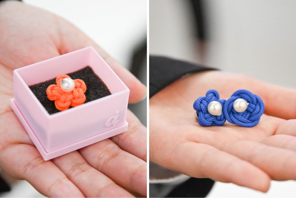 昨年度は女性用アクセサリーを制作しましたが、今年度は男性向けの商品開発に挑戦し、ラペルピンを制作しました。市場調査や競合分析を重ね、アウトドア用として知られるパラコードを土台に使用。愛南町の「町の花」であるアケボノツツジや宇和海の波をイメージしたデザインに仕上げました。学生からは「愛南町をイメージしたデザインにするのが一番苦労しました。愛南町出身の母にも話を聞き、イメージを固めていきました」との声が聞かれ、地域への深い理解と思い入れが感じられる作品となりました。