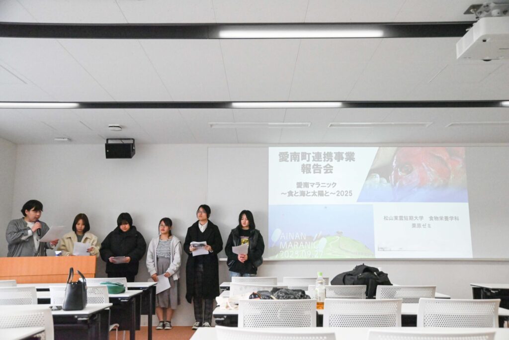 続いて、松山東雲短期大学 食物栄養学科 栗原ゼミの学生たちによる「愛南マラニック〜食と海と太陽と〜2025」での補給食についての発表が行われました。