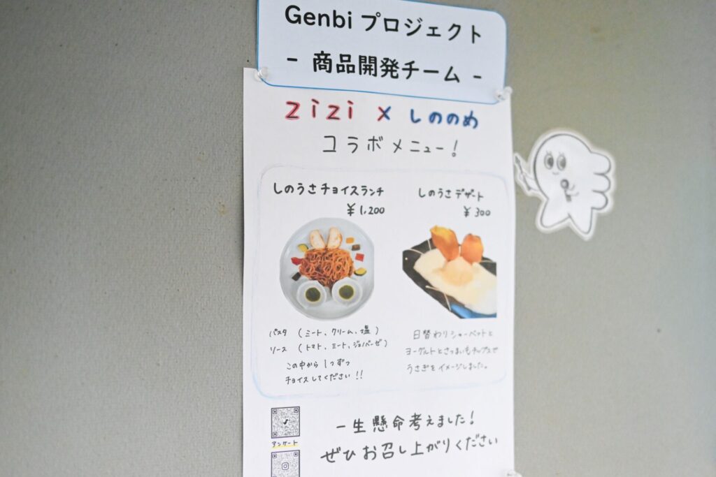 ZIZIのおいしい料理を味わうことと大学のPRを両立するメニューの販売を目標に掲げ、ターゲットをファミリー層に設定。オリジナルキャラクター「しのうさ」をモチーフにした「しのうさチョイスランチ」とデザートを考案しました。いずれもウサギの耳にこだわったメニューで、料理を待つ間に楽しめるオリジナル絵本も作成しました。