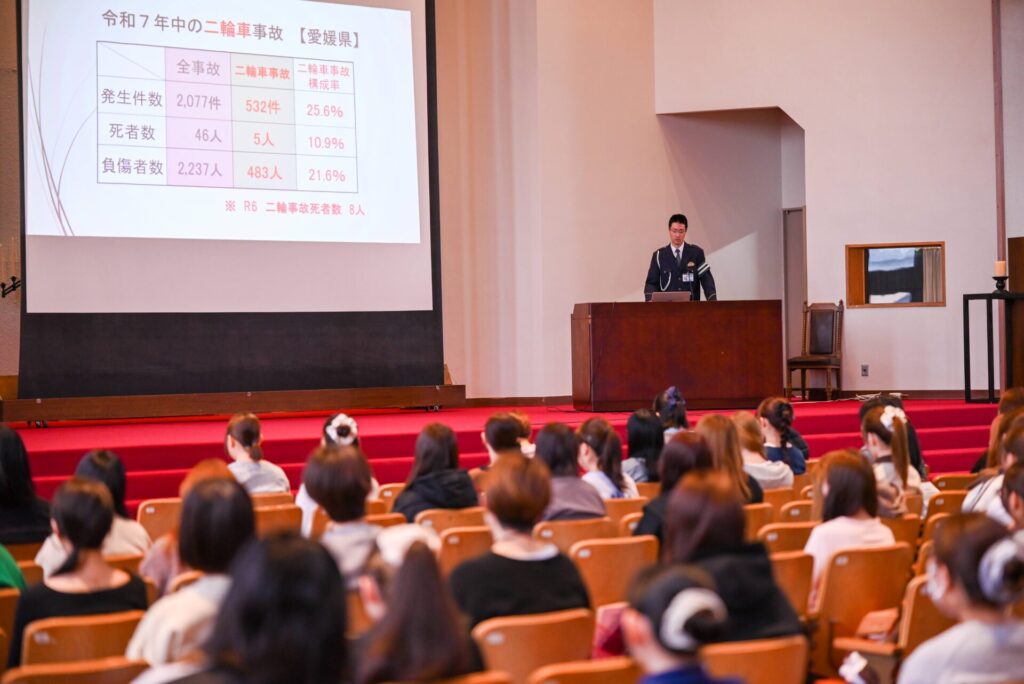 2026年4月7日(火)、本学チャペルにて、松山東警察署の警察官を講師にお招きし、新入生約200名を対象とした「防犯・交通安全講話」を実施しました。