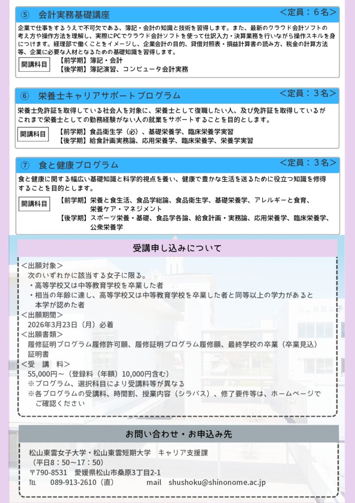 | 6 | 松山東雲短期大学 | 前学期後学期 | 栄養士キャリアサポートプログラム | 栄養士免許証を取得している社会人を対象に、栄養士として復職したい人、及び免許証を取得しているがこれまで栄養士としての勤務経験がない人の就業をサポートすることを目的とします。 | 3/23(月) 必着 |