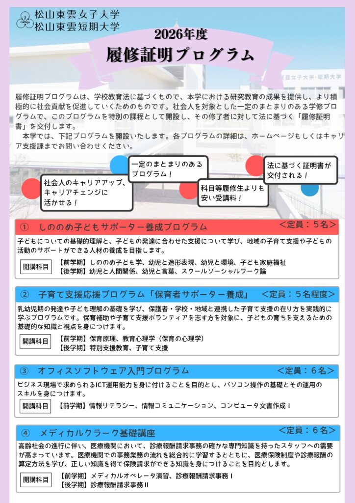 | 2 | 松山東雲短期大学 | 前学期後学期 | 子育て支援応援プログラム「保育者サポーター養成」 | 乳幼児期の発達や子ども理解の基礎を学び、保護者・学校・地域と連携した子育て支援の在り方を実践的に学ぶプログラムです。子どもの育ちを支えるための基礎的な知識と視点を身につけます。※保育補助や子育て支援ボランティアを志す方を対象 | 3/23(月) 必着 |
